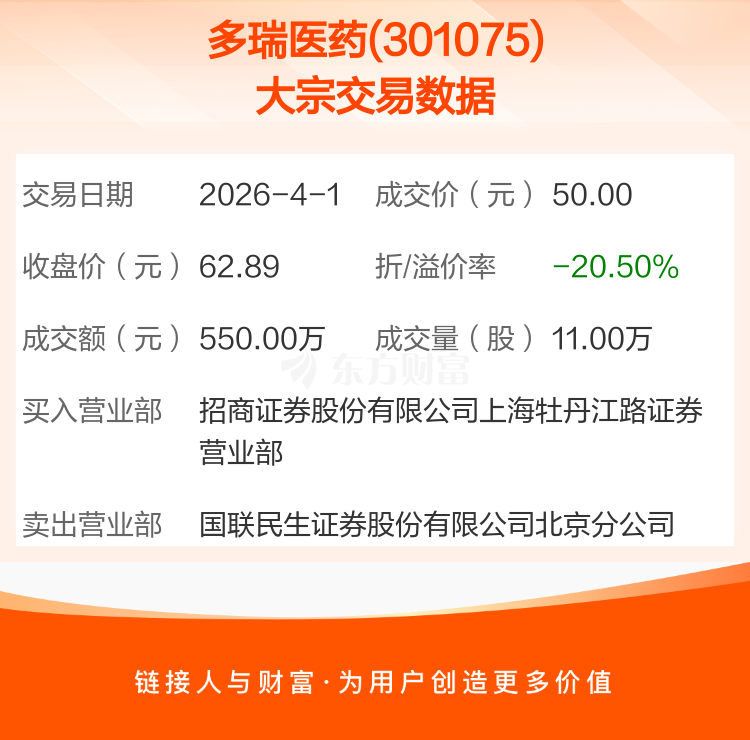 2026年4月1日,多瑞医药发生1笔大宗交易,共成交11.00万股,成交金额550.00万元,占其流通市值比例为0.11%。