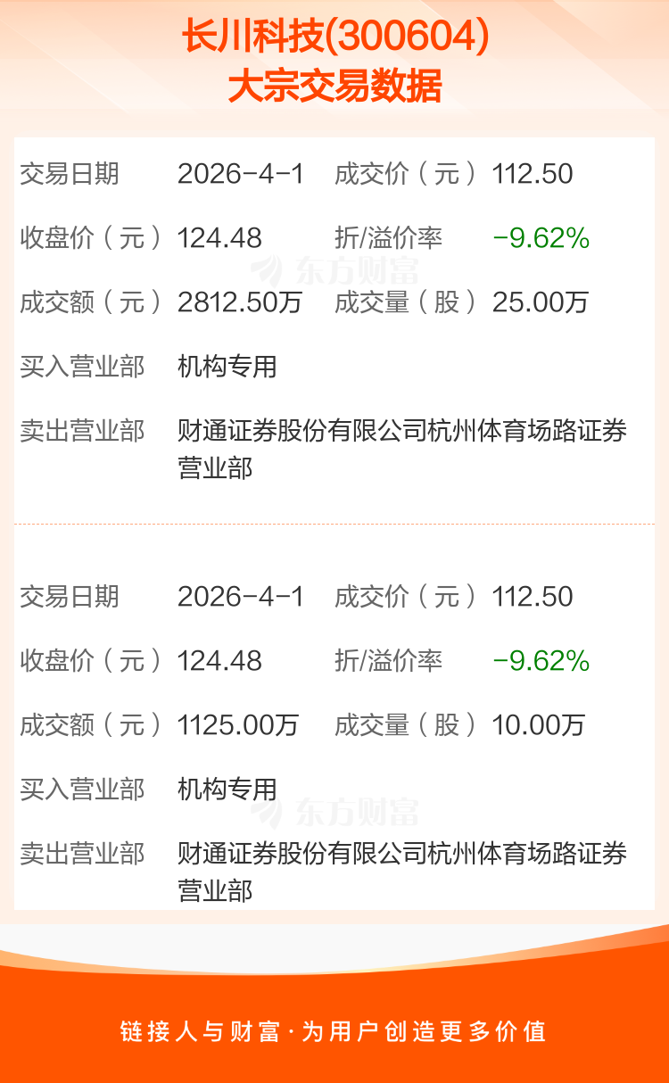 2026年4月1日,长川科技发生2笔大宗交易,共成交35.00万股,成交金额3937.50万元,占其流通市值比例为0.06%。