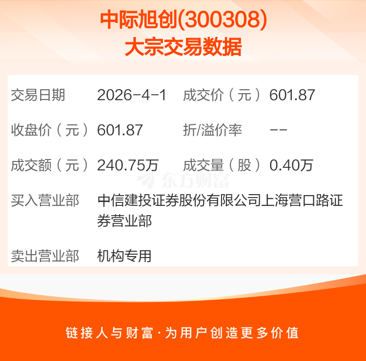 2026年4月1日,中际旭创发生1笔大宗交易,共成交4000股,成交金额240.75万元。