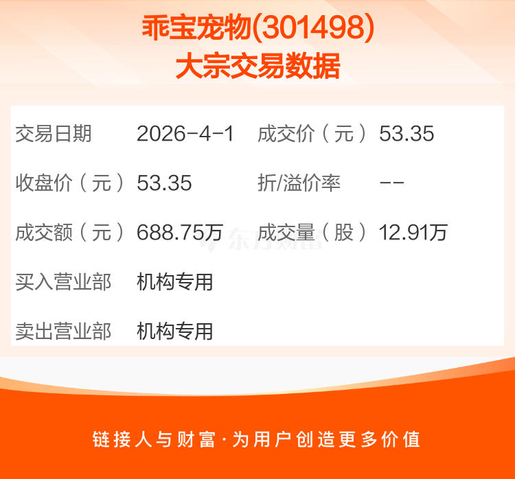2026年4月1日,乖宝宠物发生1笔大宗交易,共成交12.91万股,成交金额688.75万元,占其流通市值比例为0.07%。