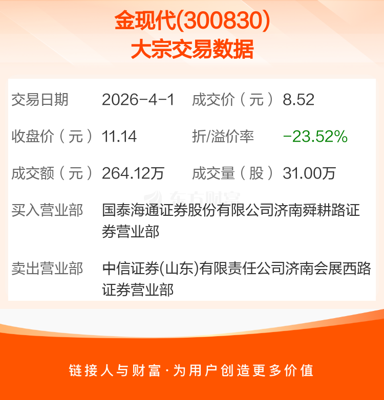 2026年4月1日,金现代发生1笔大宗交易,共成交31.00万股,成交金额264.12万元,占其流通市值比例为0.07%。