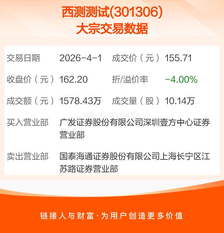 2026年4月1日,西测测试发生1笔大宗交易,共成交10.14万股,成交金额1578.43万元,占其流通市值比例为0.17%。