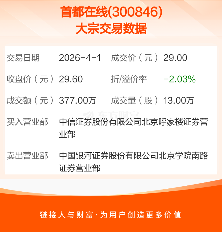 2026年4月1日,首都在线发生1笔大宗交易,共成交13.00万股,成交金额377.00万元,占其流通市值比例为0.03%。
