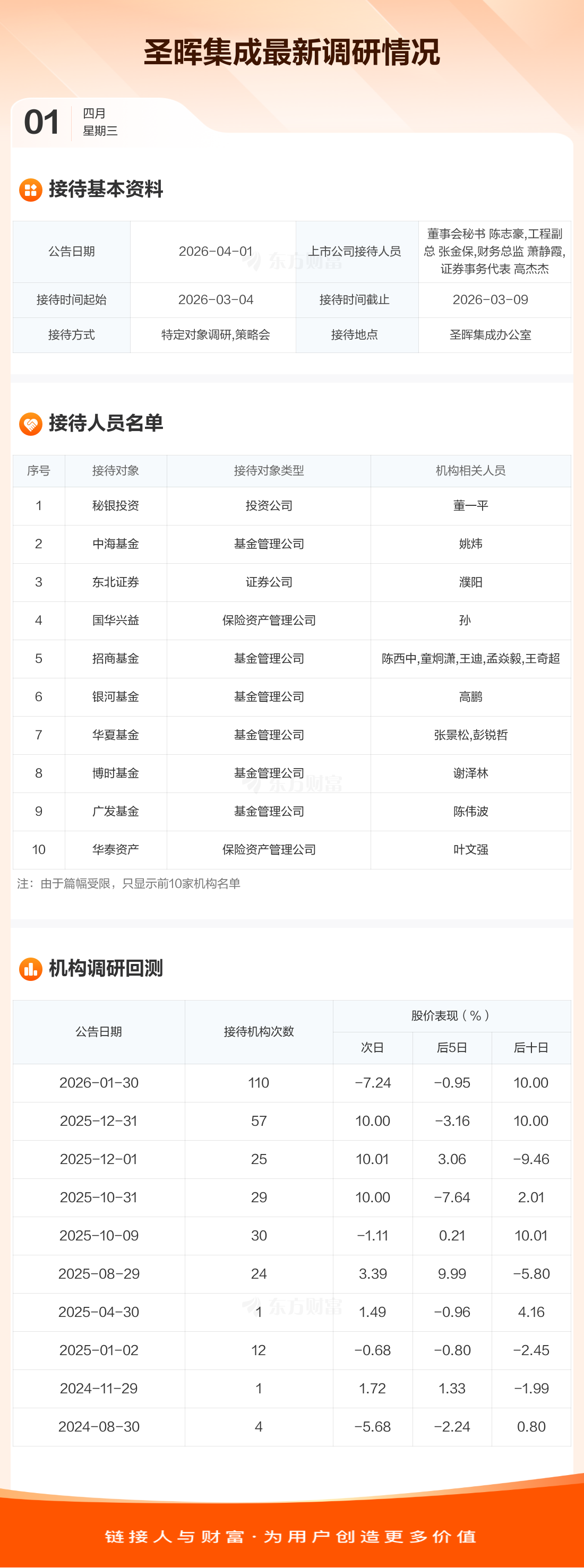 圣晖集成4月1日公告称,3月4日至3月9日接待秘银投资等54家机构调研。接待人员包括董事会秘书 陈志豪,工程副总 张金保,财务总监 萧静霞,证券事务代表 高杰杰。