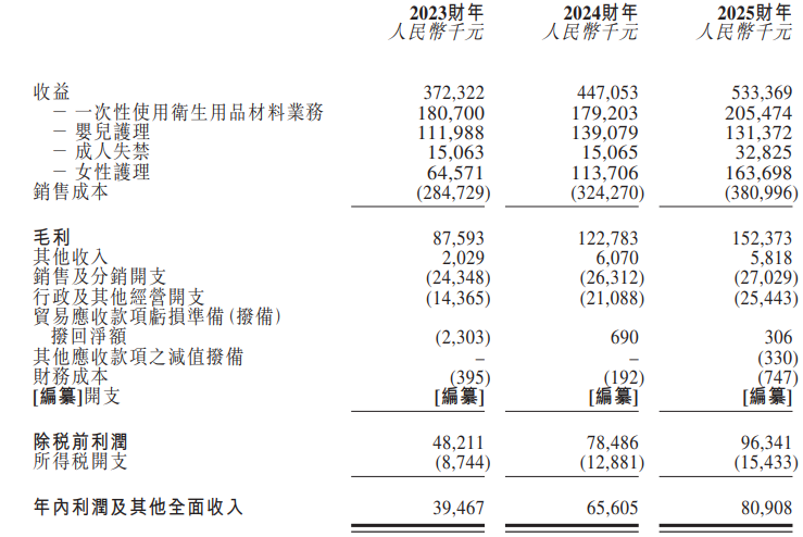 2023年至2025年(下称“报告期”),公司营收分别为3.72亿元、4.47亿元、5.33亿元;毛利分别为8759万元、1.23亿元、1.52亿元;年内利润分别为3947万元、6561万元、8091万元。