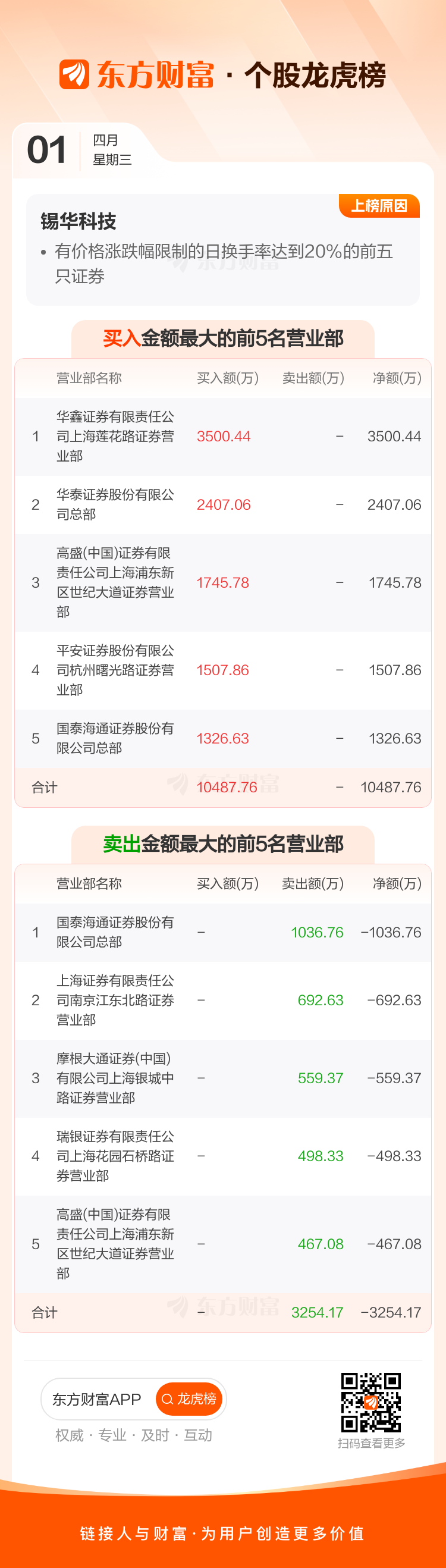 交易所2026年4月1日公布的交易公开信息显示,锡华科技因成为有价格涨跌幅限制的日换手率达到20%的前五只证券上榜。锡华科技当日收报30.07元,涨跌幅9.99%,偏离值25.41%,换手率25.41%,成交额5.22亿。