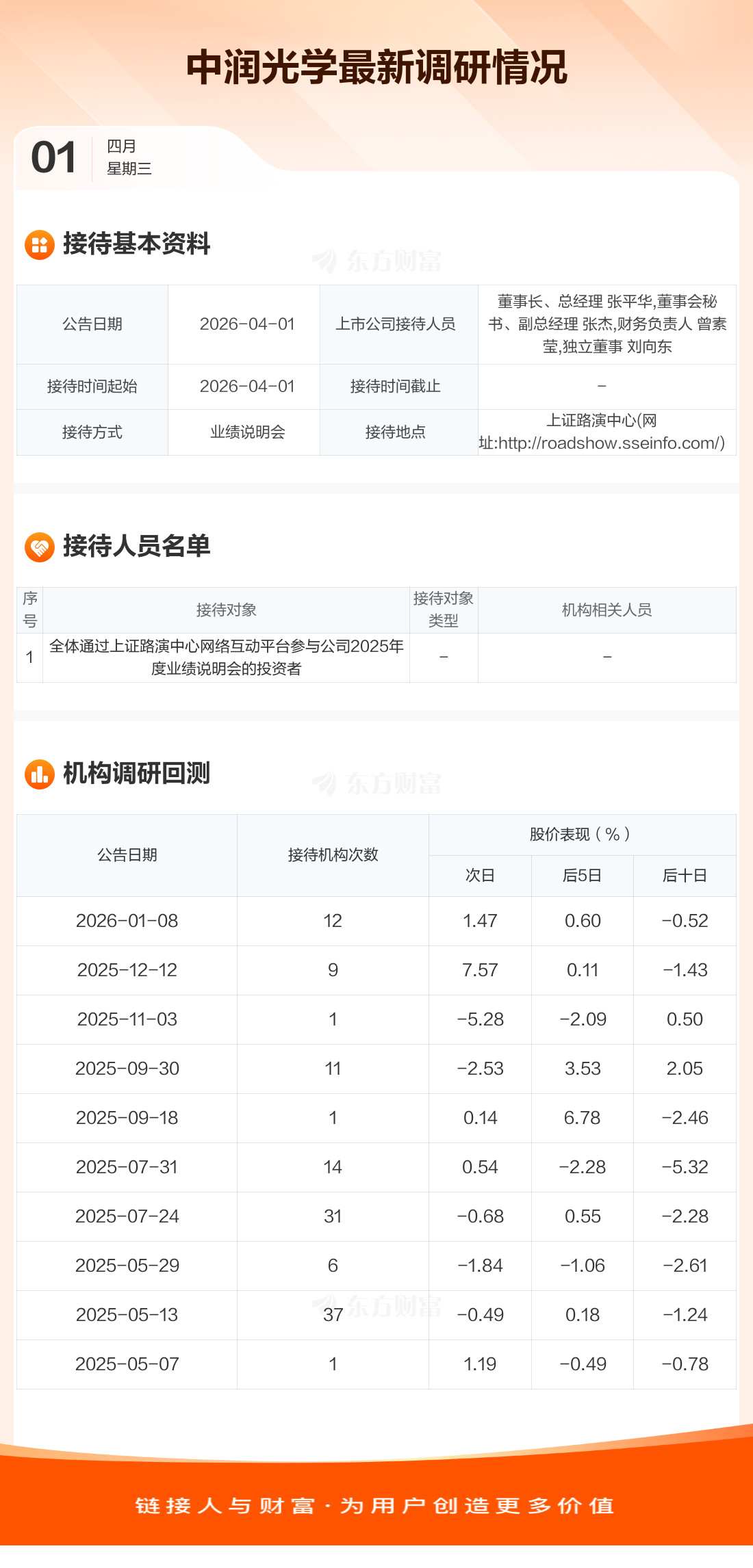 中润光学4月1日公告称,4月1日接待全体通过上证路演中心网络互动平台参与公司2025年度业绩说明会的投资者等1家机构调研。接待人员包括董事长、总经理 张平华,董事会秘书、副总经理 张杰,财务负责人 曾素莹,独立董事 刘向东。