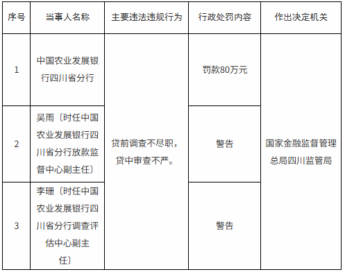 【大河财立方消息】4月1日,中国农业发展银行四川省分行披露的行政处罚信息显示,因贷前调查不尽职,贷中审查不严,中国农业发展银行四川省分行被罚款80万元。时任该行放款监督中心副主任吴雨、时任该行调查评估中心副主任李珊被警告。