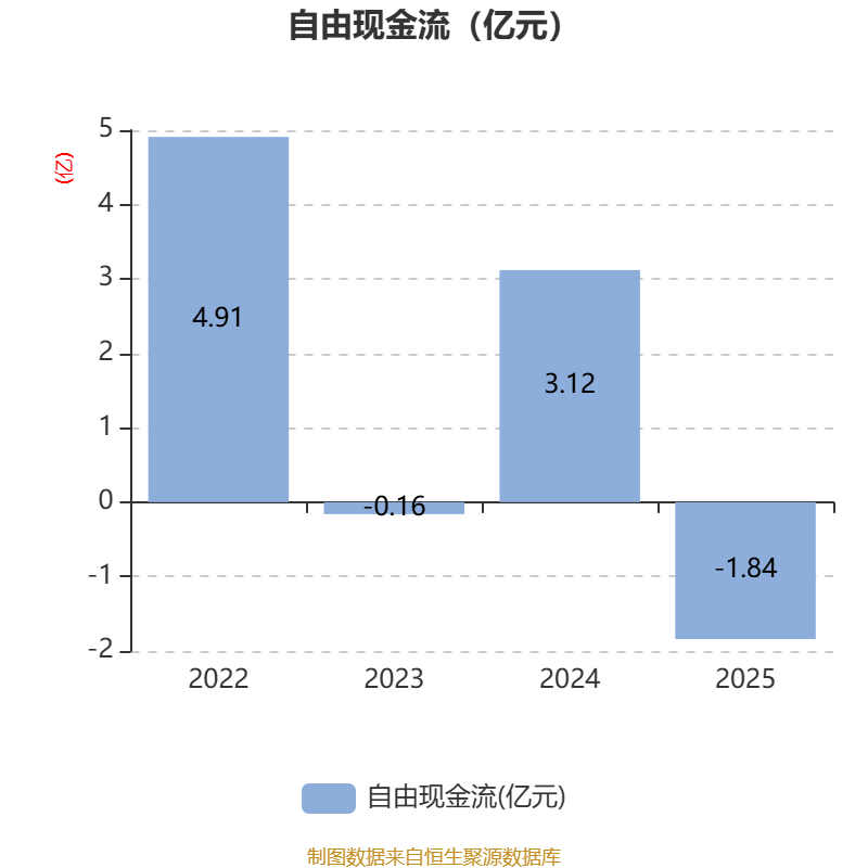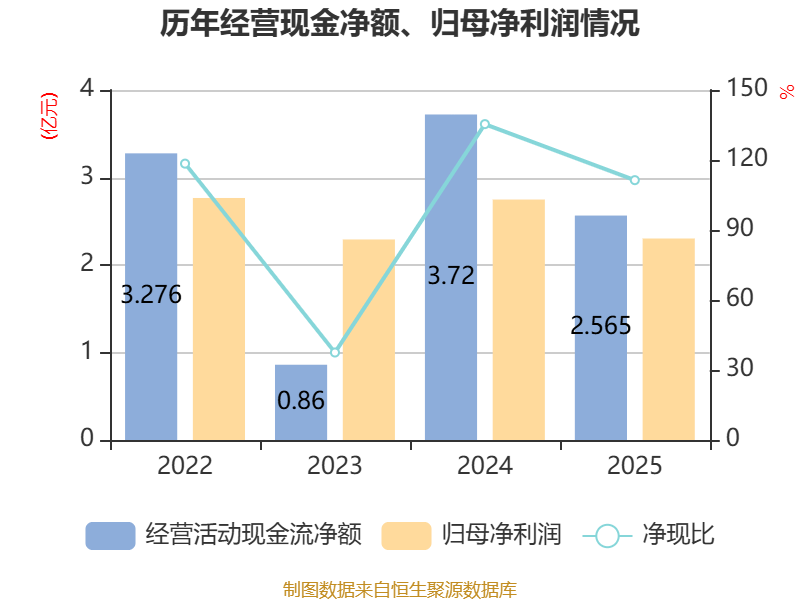截至2025年,公司经营活动现金流净额为2.57亿元,同比下降31.05%;筹资活动现金流净额-1569.14万元,同比减少2552.25万元;投资活动现金流净额-1.19亿元,上年同期为-3.05亿元。