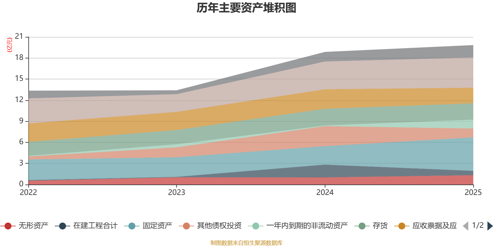 资产重大变化方面,截至2025年末,公司固定资产较上年末增加81.8%,占公司总资产比重上升10.13个百分点;其他债权投资较上年末减少56.19%,占公司总资产比重下降8.83个百分点;在建工程合计较上年末减少65.74%,占公司总资产比重下降6.5个百分点;一年内到期的非流动资产较上年末增加1119.06%,占公司总资产比重上升5.8个百分点。