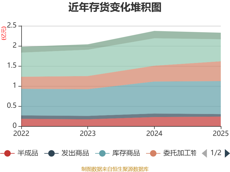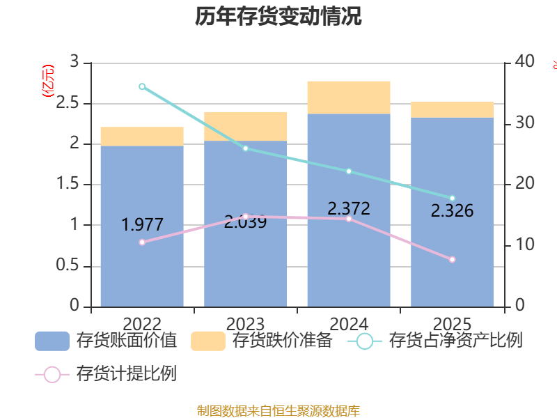 从存货变动来看,截至2025年末,公司存货账面价值为2.33亿元,占净资产的17.77%,较上年末减少456.6万元。其中,存货跌价准备为1943.88万元,计提比例为7.71%。