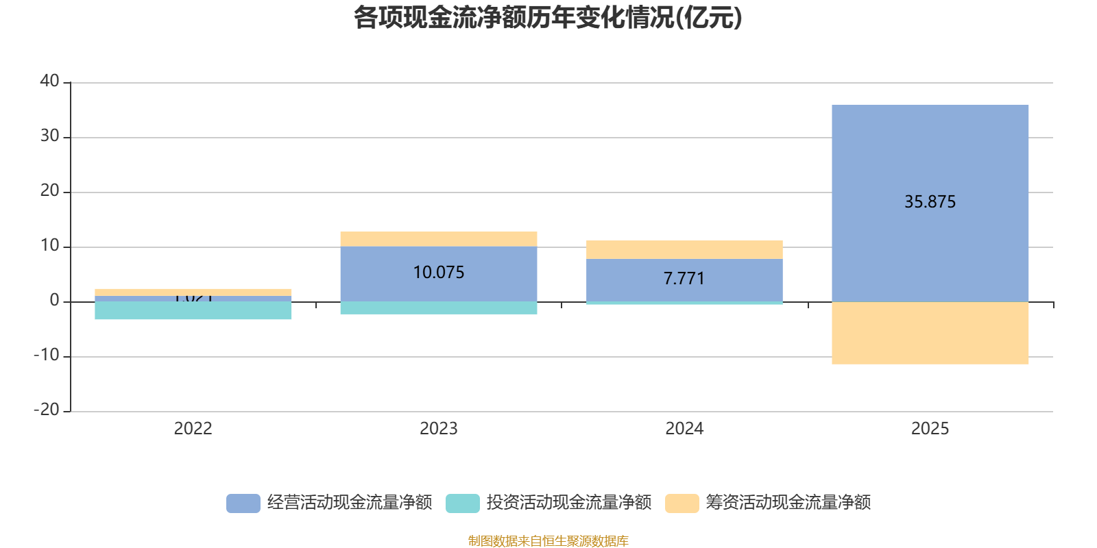 2025年,公司经营活动现金流净额为35.87亿元,同比增长361.68%;筹资活动现金流净额-11.38亿元,同比减少14.74亿元;投资活动现金流净额-971.1万元,上年同期为-5710.2万元。