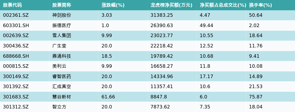 南财智讯4月1日电,盘后数据显示,因当日异动登上龙虎榜的个股中,资金净买入最多的前三位分别是神剑股份(002361.SZ)、振德医疗(603301.SH)与雪人集团(002639.SZ)。其中排名第一的神剑股份净买额达3.14亿元,占总成交金额的4.47%。神剑股份当日收盘上涨3.03%,换手率为50.64%,净买入额前10个股详情见下图: