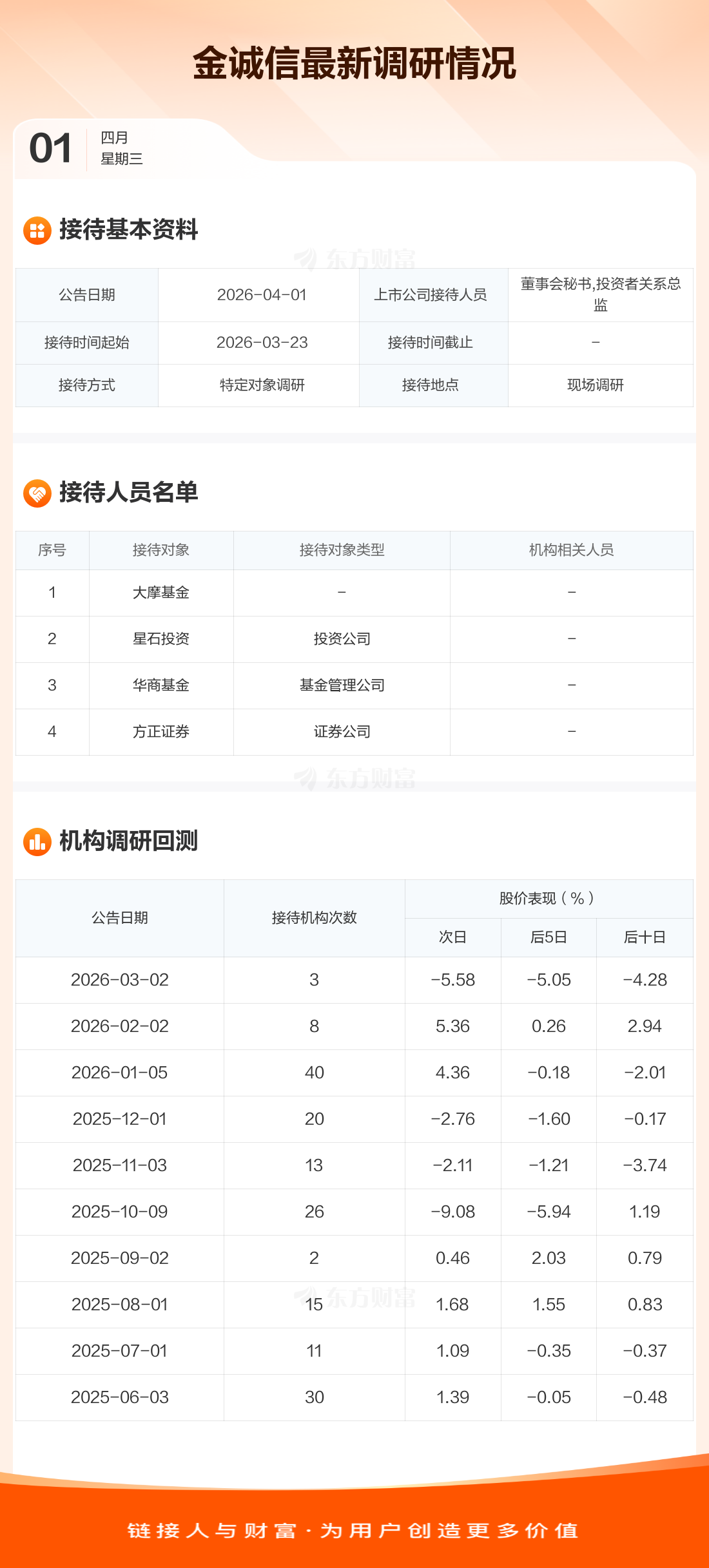 金诚信4月1日公告称,3月23日接待大摩基金等4家机构调研。接待人员包括董事会秘书,投资者关系总监。