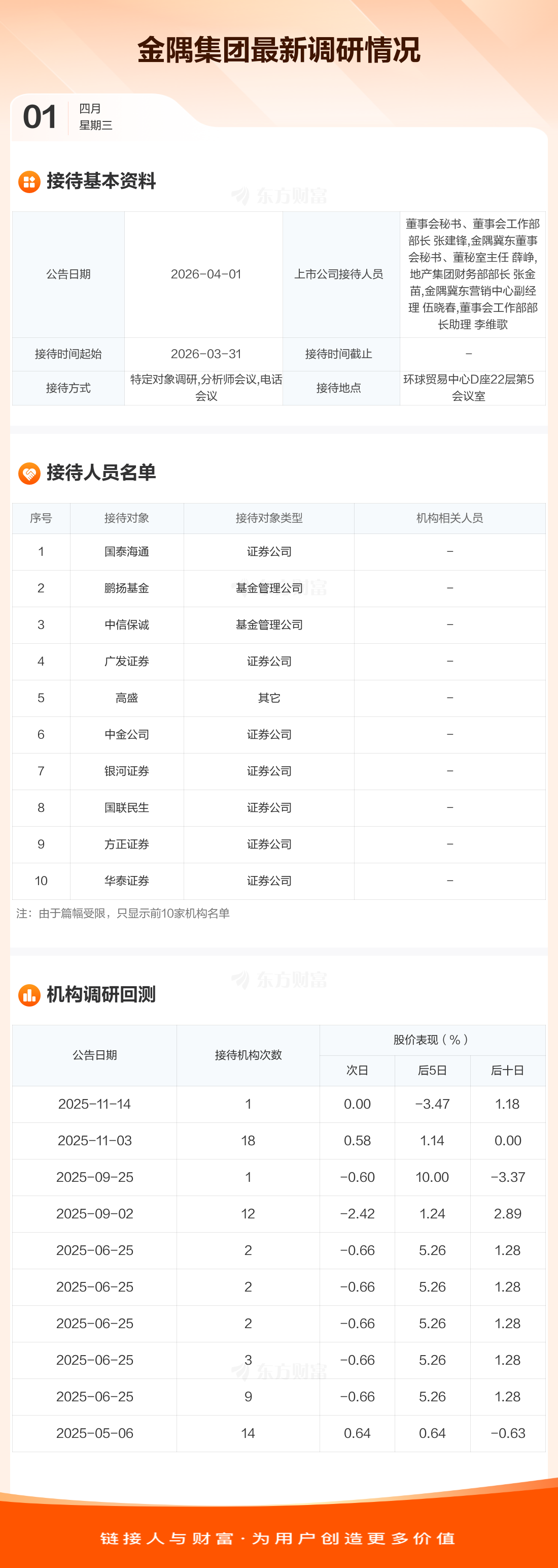 金隅集团4月1日公告称,3月31日接待国泰海通等17家机构调研。接待人员包括董事会秘书、董事会工作部部长 张建锋,金隅冀东董事会秘书、董秘室主任 薛峥,地产集团财务部部长 张金苗,金隅冀东营销中心副经理 伍晓春,董事会工作部部长助理 李维歌。