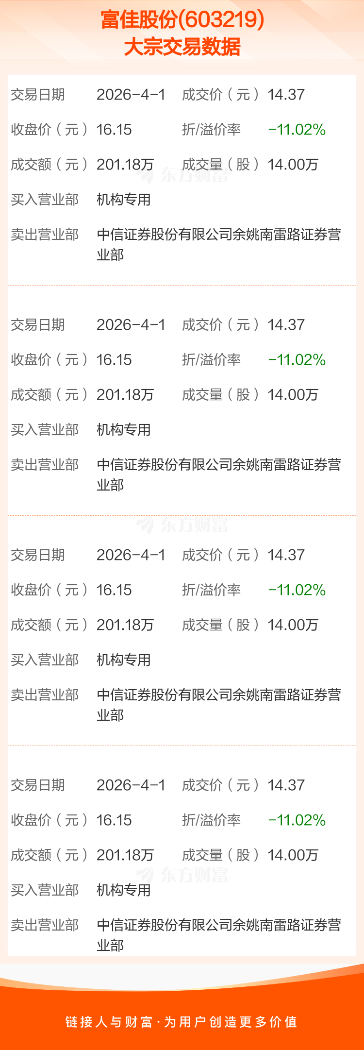 2026年4月1日,富佳股份发生4笔大宗交易,共成交56.00万股,成交金额804.72万元,占其流通市值比例为0.09%。