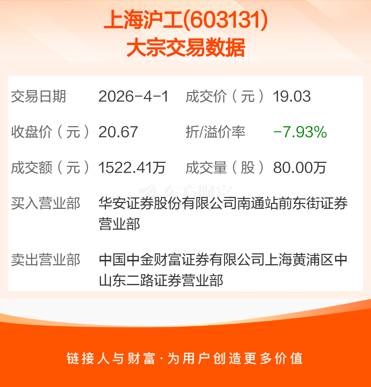 2026年4月1日,上海沪工发生1笔大宗交易,共成交80.00万股,成交金额1522.41万元,占其流通市值比例为0.22%。
