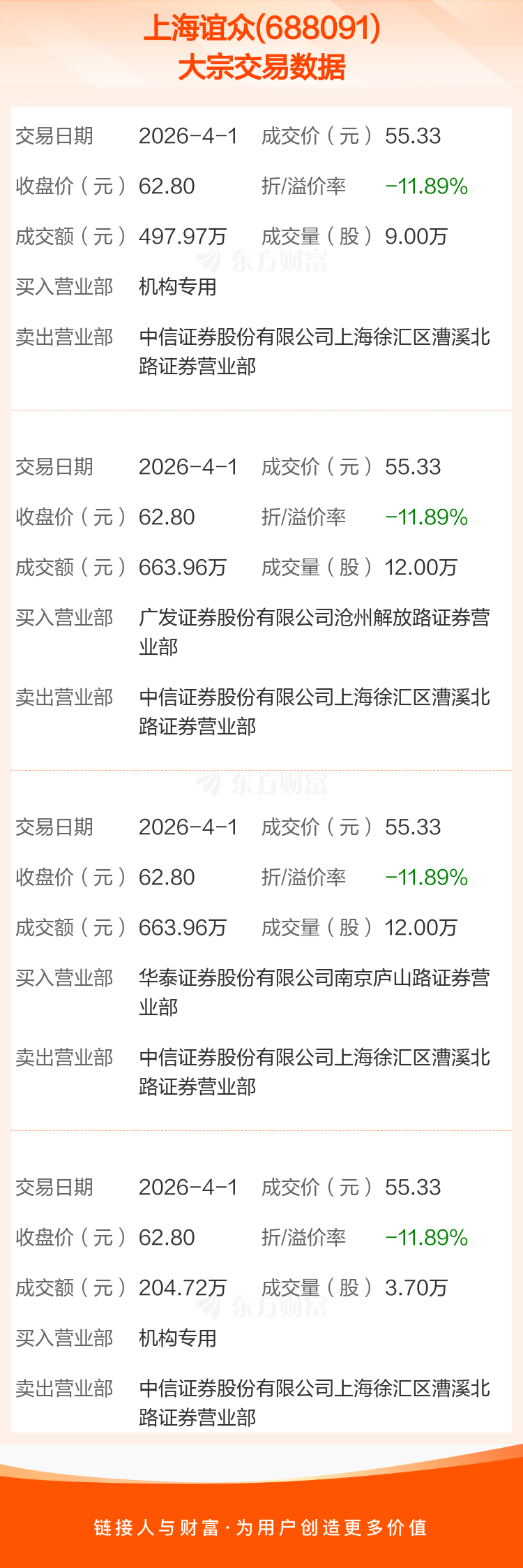 2026年4月1日,上海谊众发生4笔大宗交易,共成交36.70万股,成交金额2030.61万元,占其流通市值比例为0.16%。