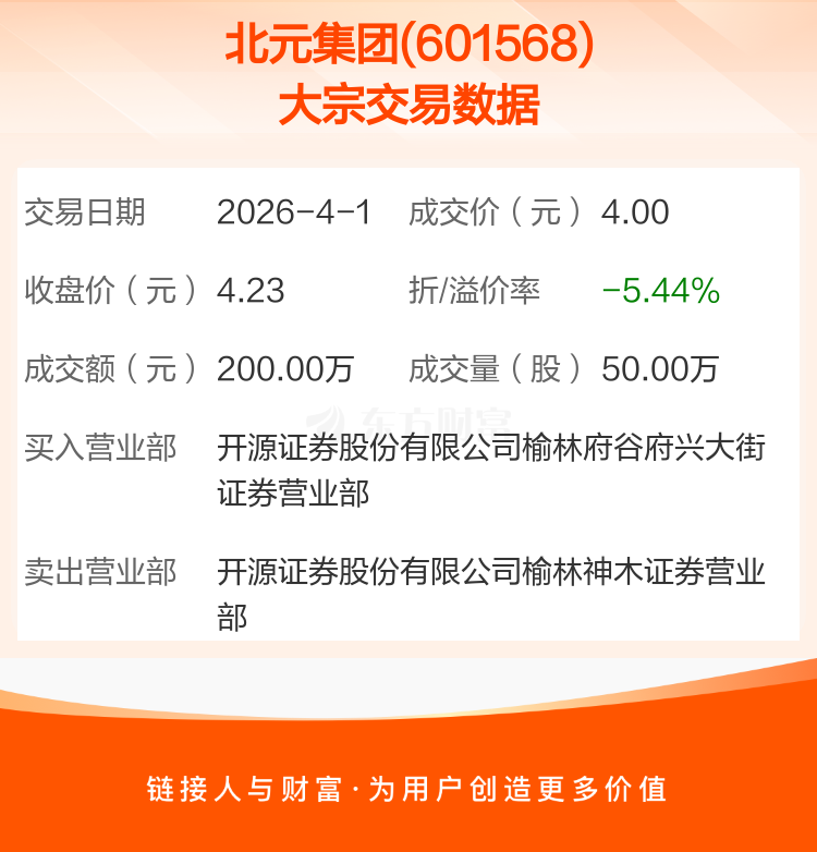 2026年4月1日,北元集团发生1笔大宗交易,共成交50.00万股,成交金额200.00万元,占其流通市值比例为0.01%。
