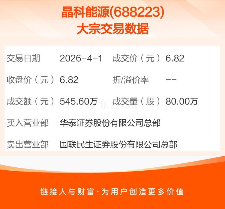 2026年4月1日,晶科能源发生1笔大宗交易,共成交80.00万股,成交金额545.60万元。