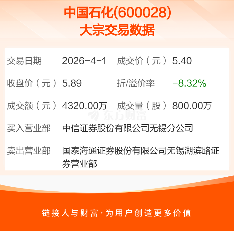 2026年4月1日,中国石化发生1笔大宗交易,共成交800.00万股,成交金额4320.00万元。