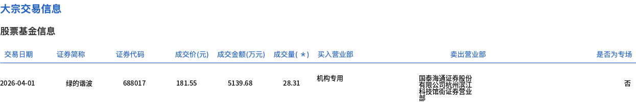 绿的谐波今日大宗交易折价成交28.31万股,成交额5139.68万元