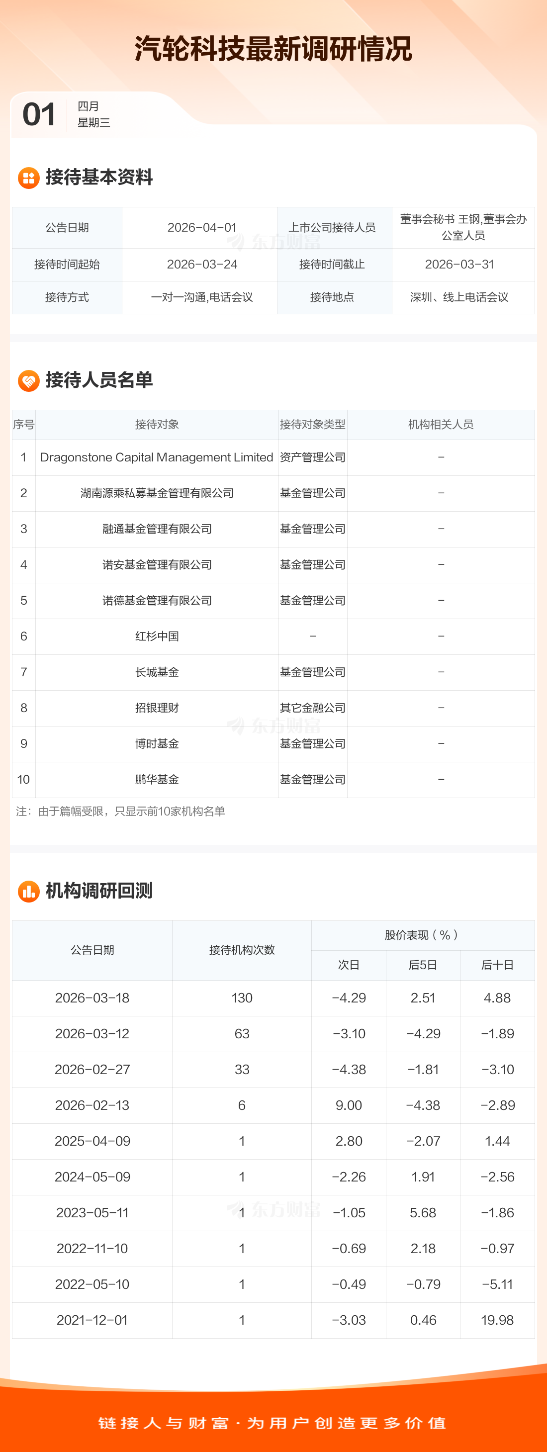 汽轮科技4月1日公告称,3月24日至3月31日接待Dragonstone Capital Management Limited等25家机构调研。接待人员包括董事会秘书 王钢,董事会办公室人员。