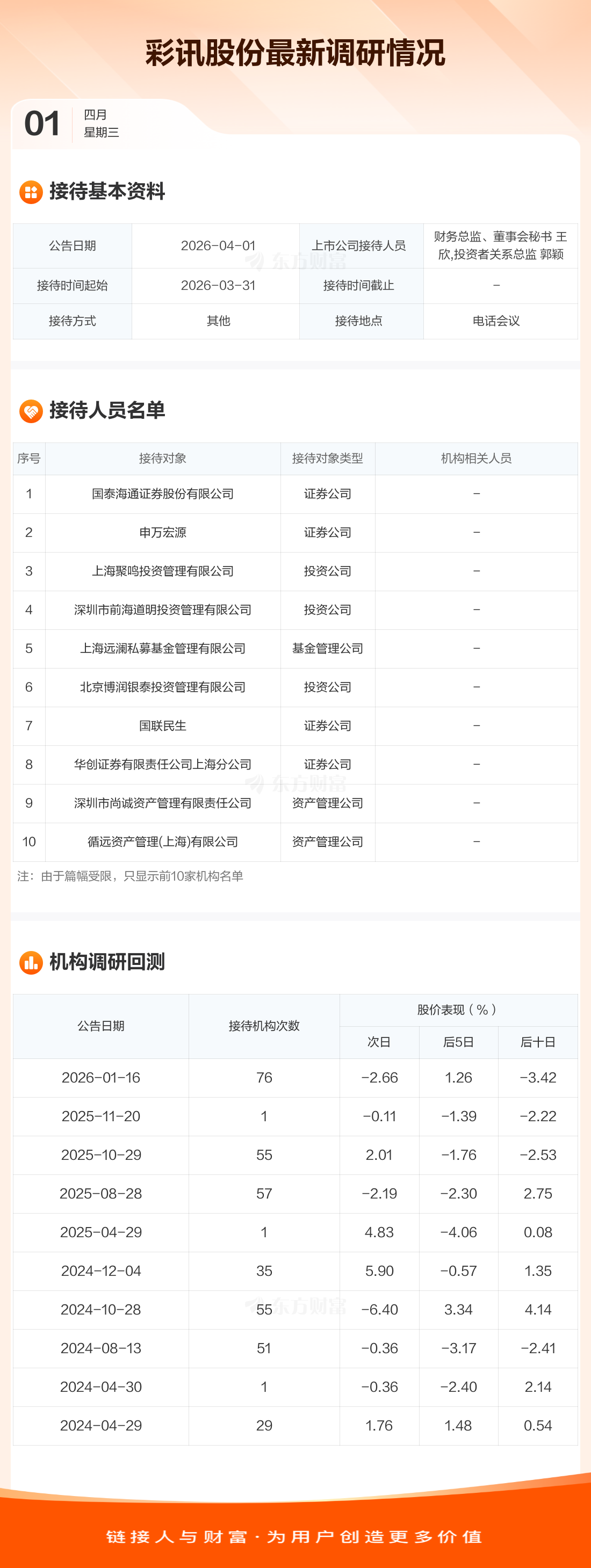 彩讯股份4月1日公告称,3月31日接待国泰海通证券股份有限公司等30家机构调研。接待人员包括财务总监、董事会秘书 王欣,投资者关系总监 郭颖。