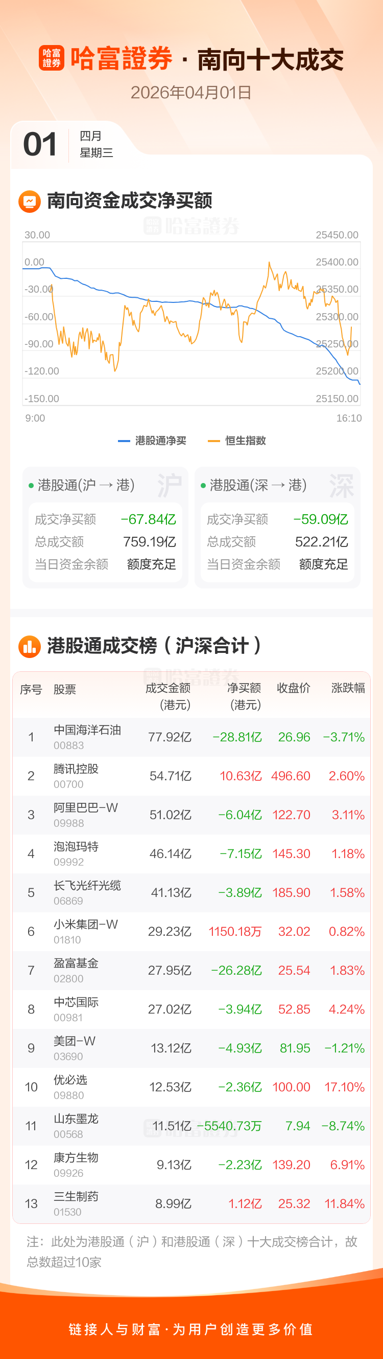 南向十大成交股中,腾讯控股、三生制药、小米集团-W分别获净买入10.63亿港元、1.12亿港元、1150.18万港元。中国海洋石油、盈富基金、泡泡玛特分别遭净卖出28.81亿港元、26.28亿港元、7.15亿港元。