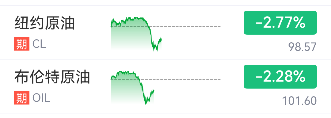 期货日报记者注意到,纽约原油、布伦特原油价格一度双双跌破100美元/桶。截至发稿,纽约原油价格下跌2.77%,报98.57美元/桶;布伦特原油价格下跌2.28%,报101.6美元/桶。