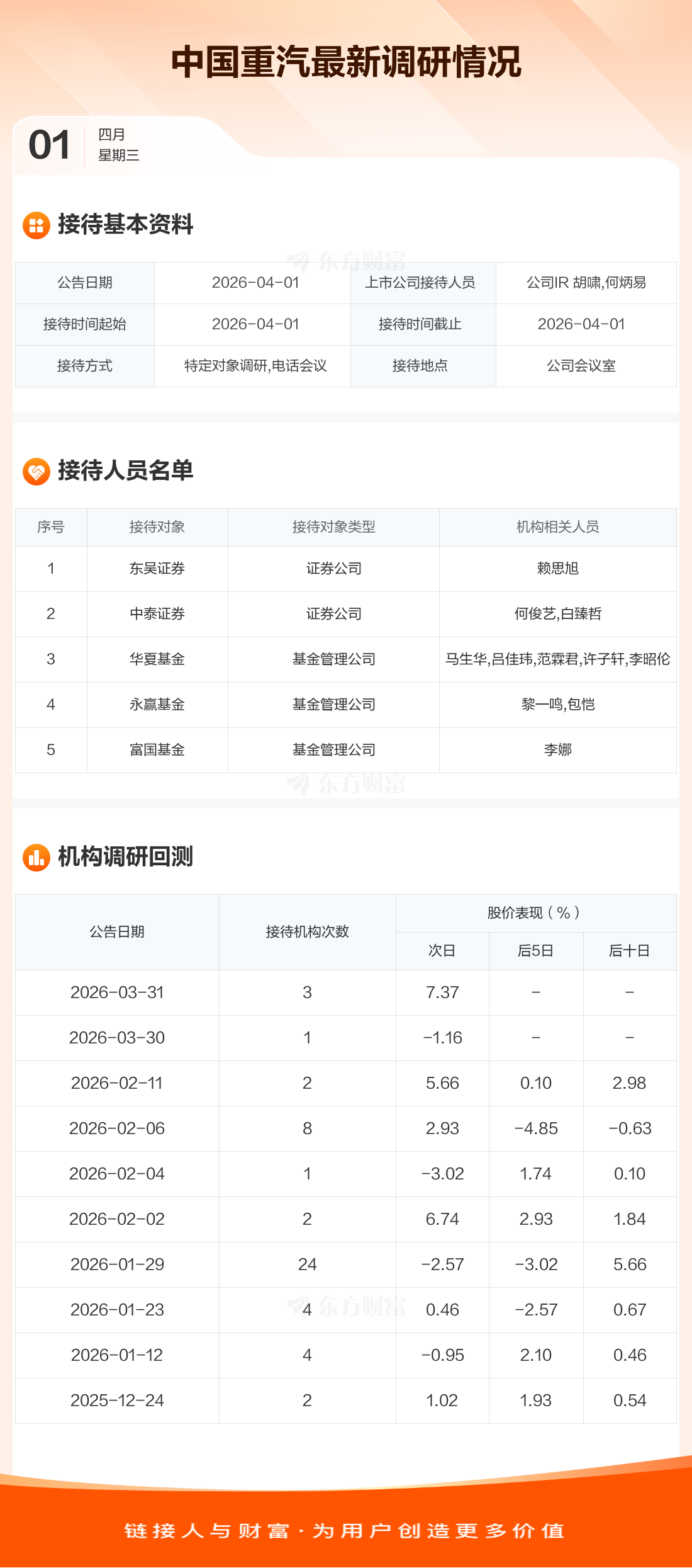 中国重汽4月1日公告称,4月1日接待东吴证券等5家机构调研。接待人员包括公司IR 胡啸,何炳易。