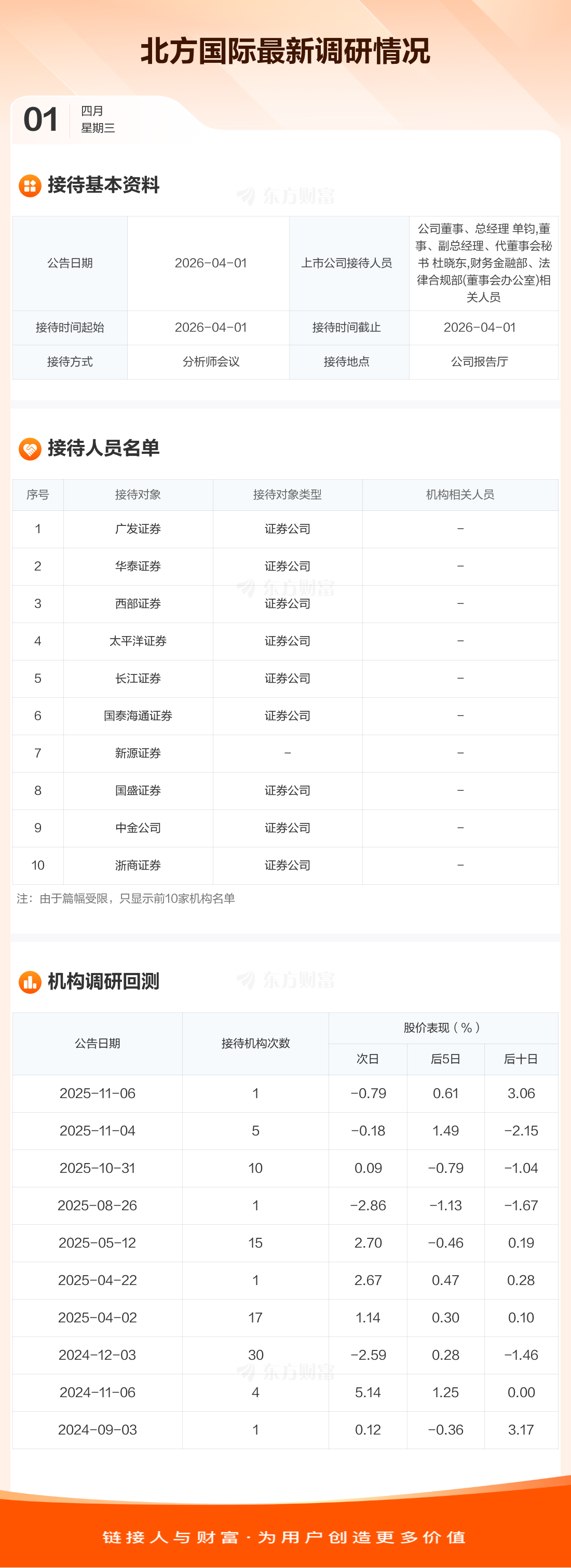 北方国际4月1日公告称,4月1日接待广发证券等15家机构调研。接待人员包括公司董事、总经理 单钧,董事、副总经理、代董事会秘书 杜晓东,财务金融部、法律合规部(董事会办公室)相关人员。