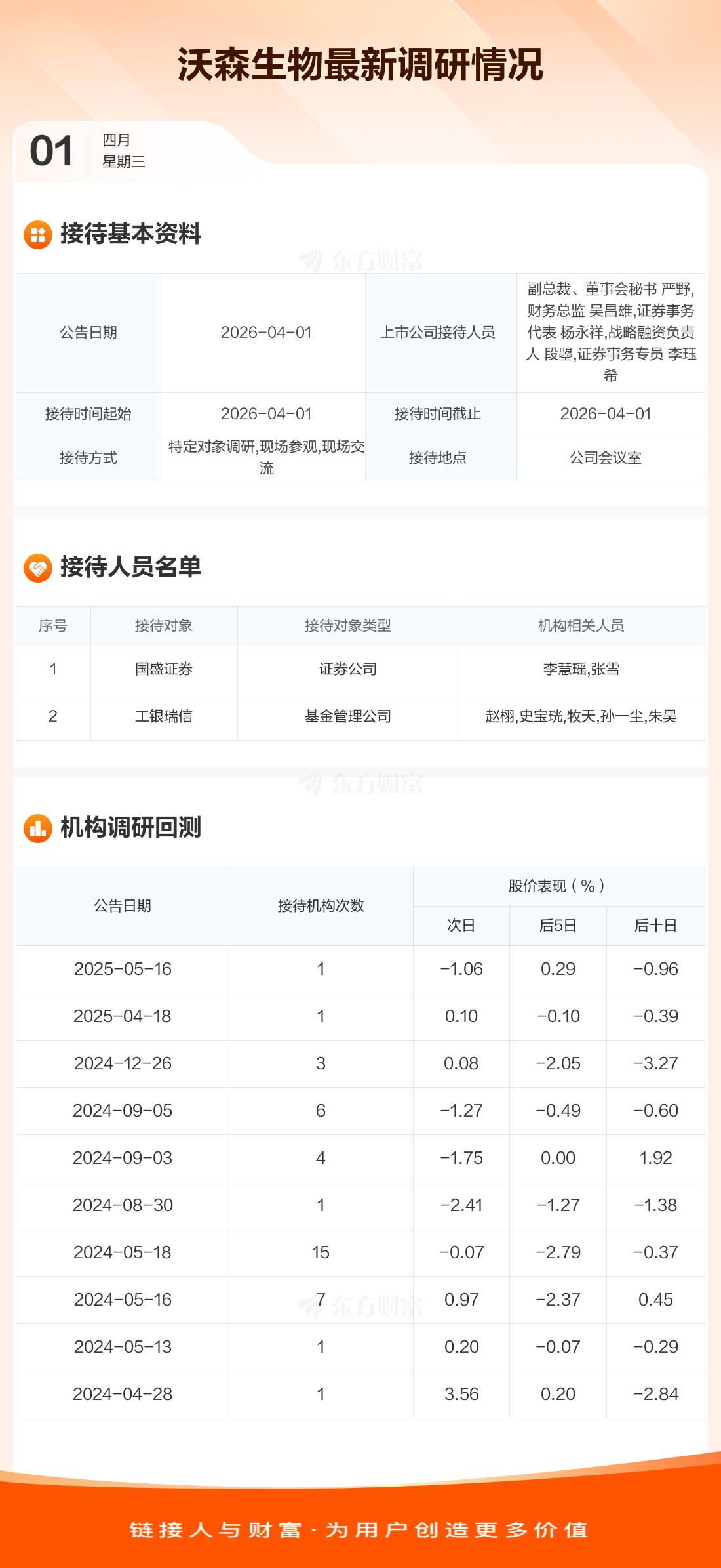 沃森生物4月1日公告称,4月1日接待国盛证券等2家机构调研。接待人员包括副总裁、董事会秘书 严野,财务总监 吴昌雄,证券事务代表 杨永祥,战略融资负责人 段曌,证券事务专员 李珏希。