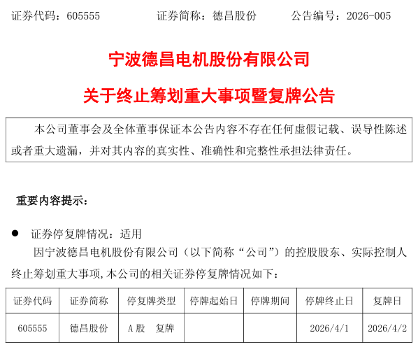 德昌股份(605555)4月1日晚间公告,公司控股股东、实际控制人因涉及事项较多,核心条款未能达成一致,决定终止筹划所持公司股份部分转让的重大事项。该事项可能导致公司实际控制人发生变更。