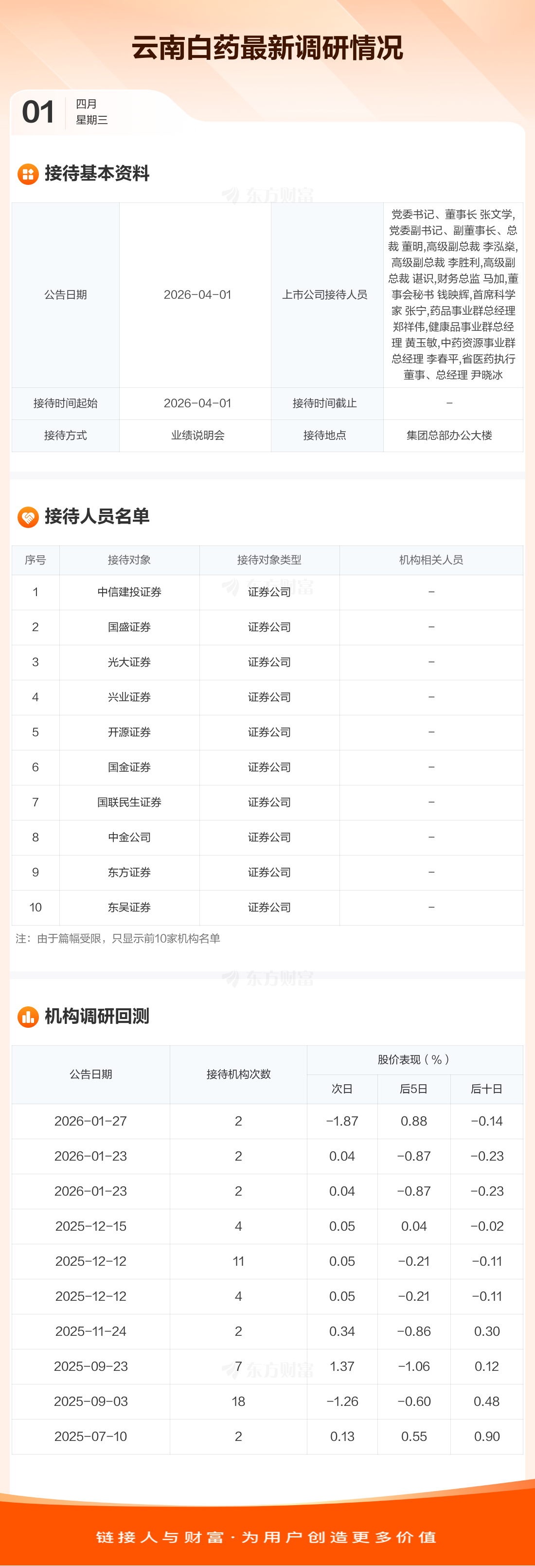 云南白药4月1日公告称,4月1日接待中信建投证券等20家机构调研。接待人员包括党委书记、董事长 张文学,党委副书记、副董事长、总裁 董明,高级副总裁 李泓燊,高级副总裁 李胜利,高级副总裁 谌识,财务总监 马加,董事会秘书 钱映辉,首席科学家 张宁,药品事业群总经理 郑祥伟,健康品事业群总经理 黄玉敏,中药资源事业群总经理 李春平,省医药执行董事、总经理 尹晓冰。
