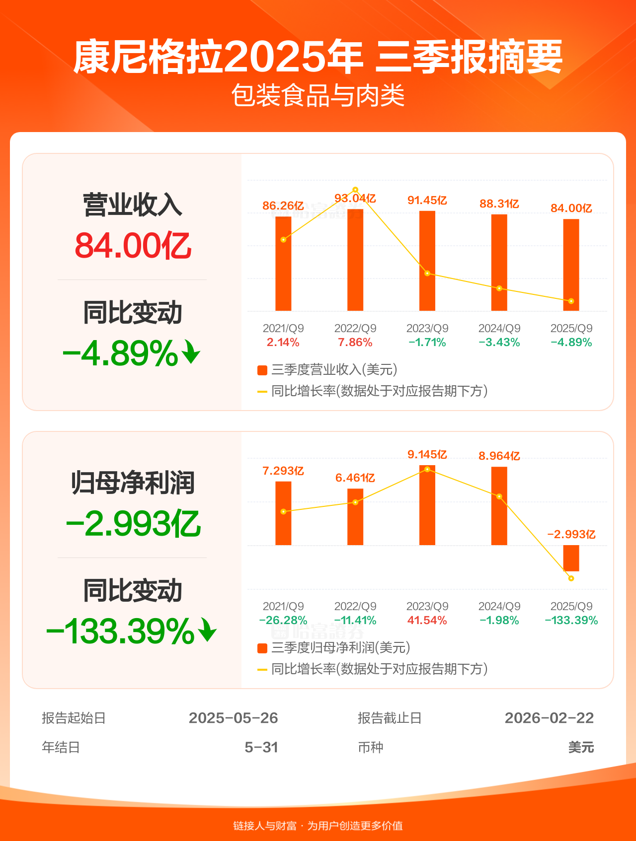 康尼格拉4月1日发布三季报业绩,截至2026年2月22日的9个月内,该公司营业收入84.00亿美元,同比减少4.89%;公司权益持有人应占溢利(归母净利润)-2.99亿美元,上年同期8.96亿美元。