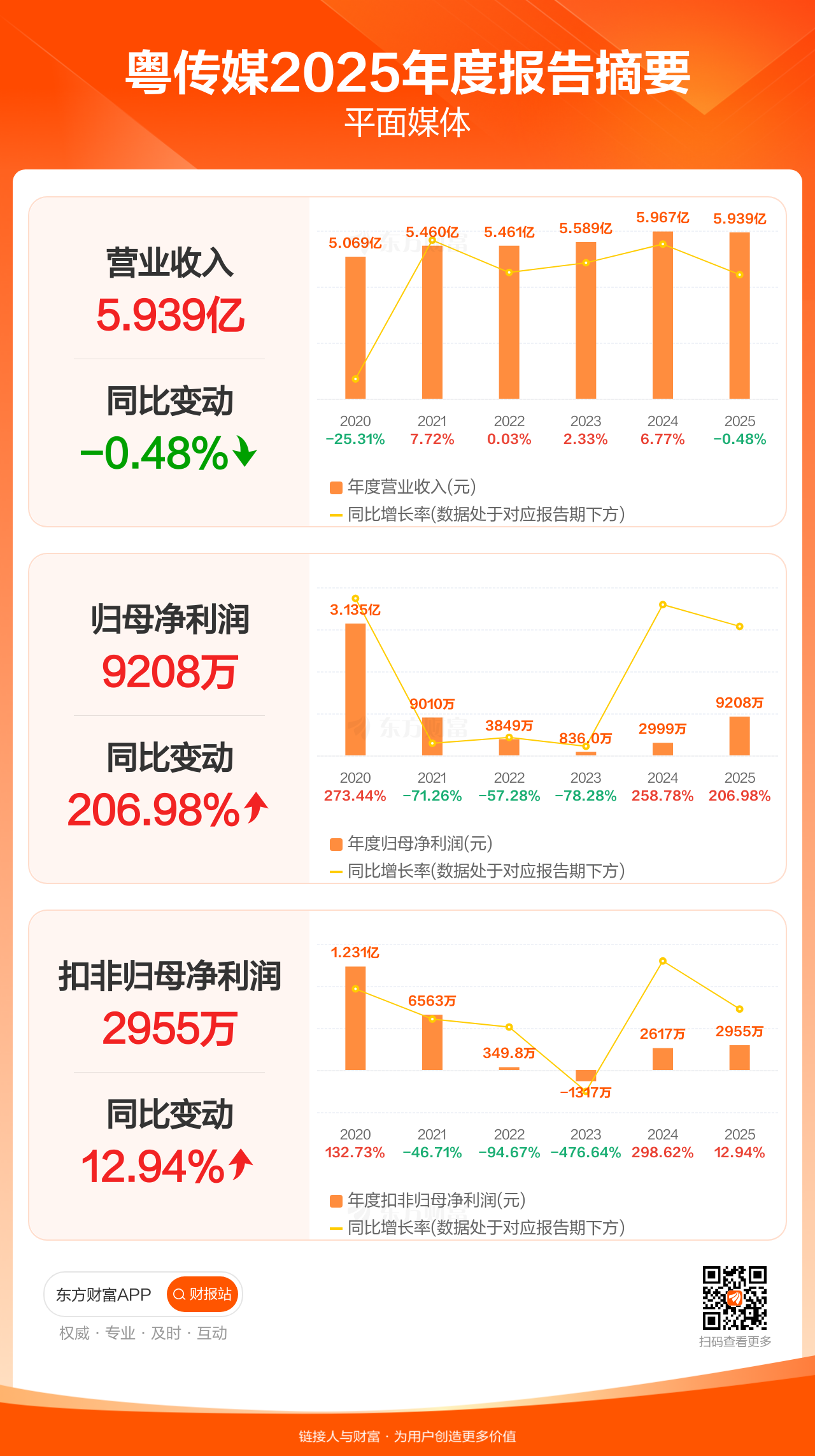 粤传媒4月2日发布2025年年报显示,公司全年实现营业收入5.94亿元,同比下滑0.48%;归母净利润9207.80万元,同比增长206.98%;扣非归母净利润2955.14万元,同比增长12.94%。