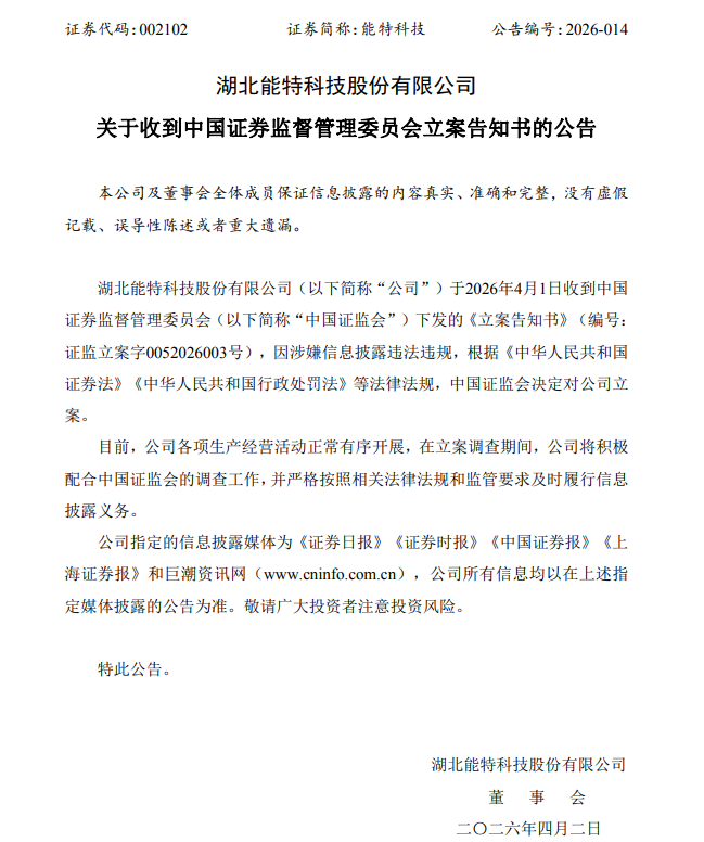 【大河财立方消息】4月1日,湖北能特科技股份有限公司(证券简称:能特科技)公告,因涉嫌信息披露违法违规,中国证监会决定对公司立案。