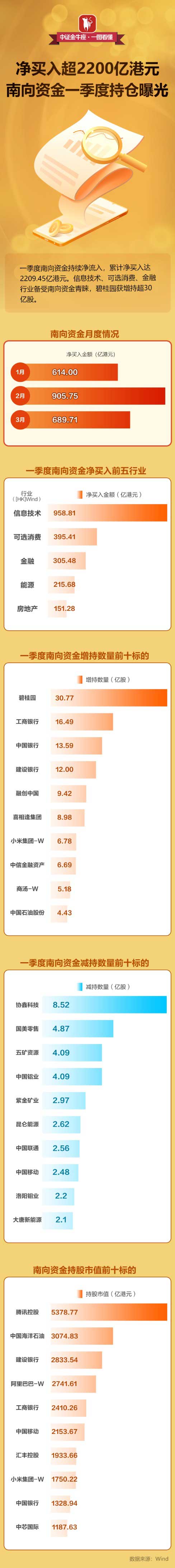 【一图看懂】净买入超2200亿港元,南向资金一季度持仓曝光
