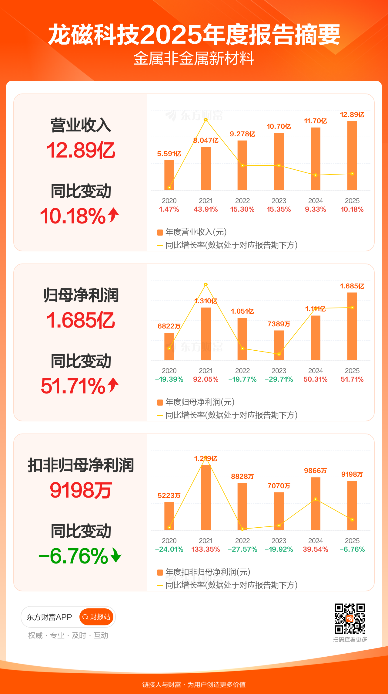 龙磁科技4月2日发布2025年年报显示,公司全年实现营业收入12.89亿元,同比增长10.18%;归母净利润1.68亿元,同比增长51.71%;扣非归母净利润9198.35万元,同比下滑6.76%。
