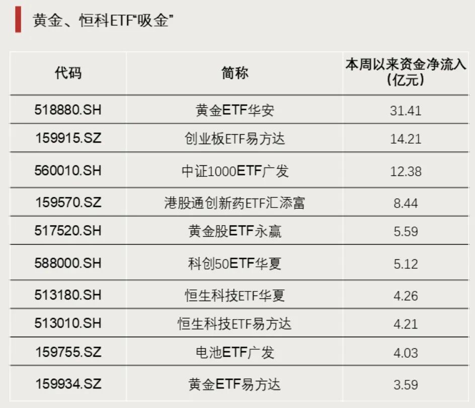 3月30日至3月31日,ETF市场合计资金净流入46亿元。黄金、港股通创新药、恒生科技相关ETF大幅“吸金”,其中黄金ETF华安资金净流入超30亿元。此外,电池、半导体等ETF也普遍吸引资金净流入。自由现金流ETF同样是近期资金追逐的热门标的,自由现金流ETF华夏、自由现金流ETF工银均吸引资金净流入。