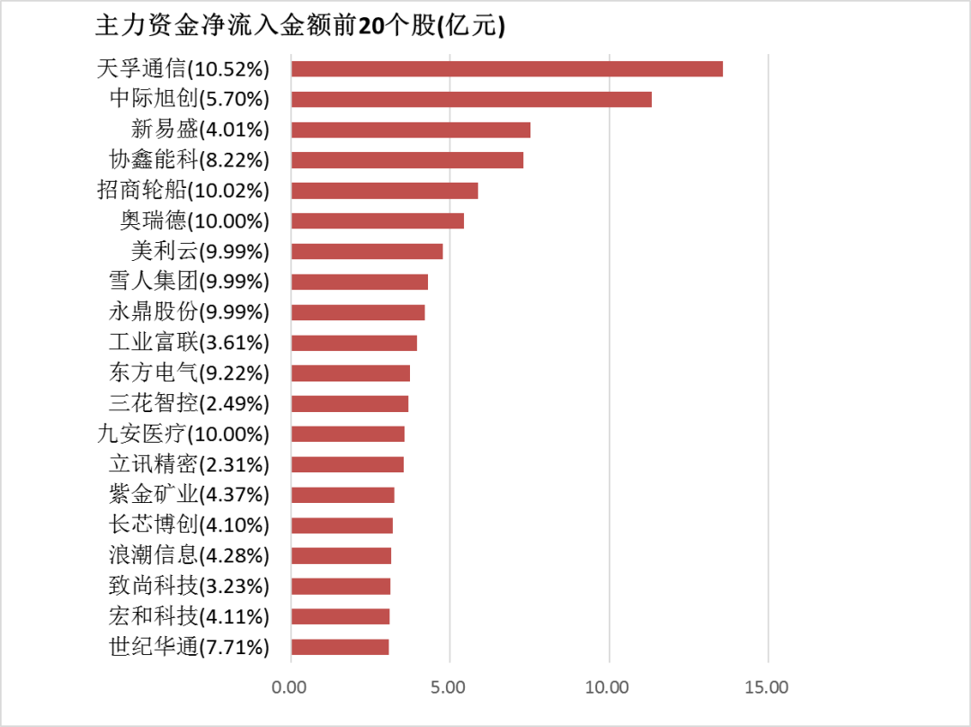今日沪深两市主力资金开盘净流入76.46亿元,尾盘净流入20.09亿元,两市全天主力资金净流入71.94亿元。
