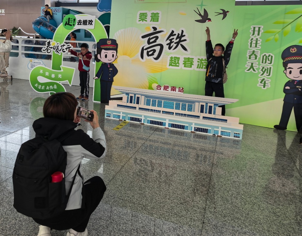 亲子旅客在合肥南站候车区“乘着高铁‘趣’春游”专属打卡点拍照留念
