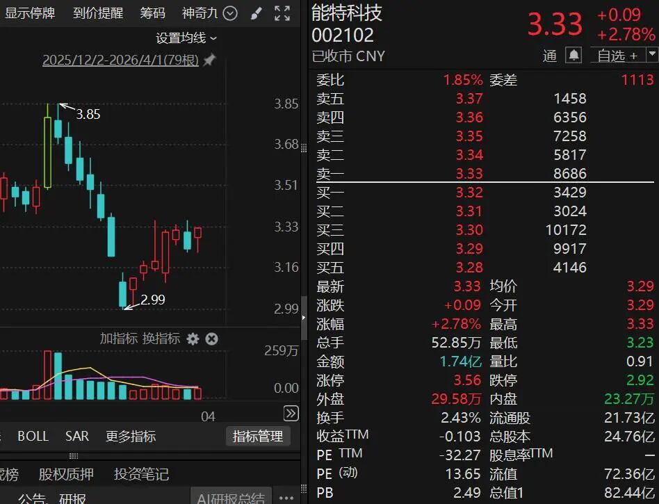 截至4月1日,能特科技市值约82亿元。截至2025年三季度末,公司股东约4.8万户。