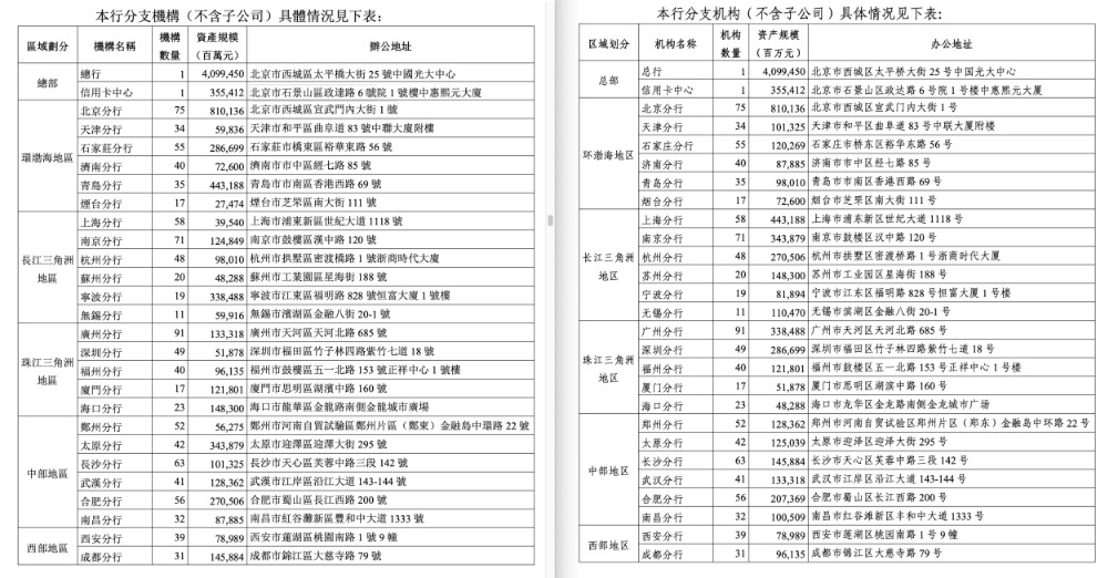 此外,该行长三角地区、珠三角地区、中部地区、部分西部地区、东北地区以及部分境外的分行数据均存在差异。