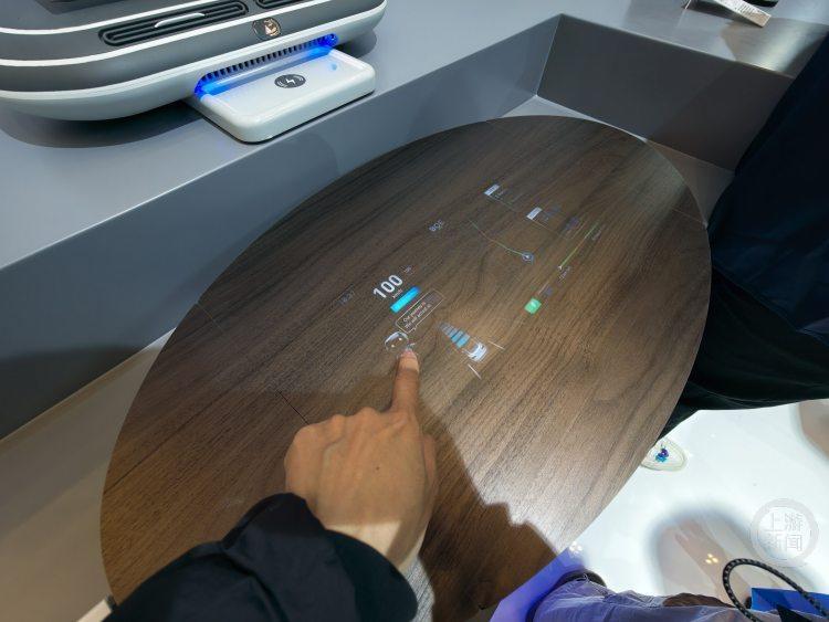 应用于智能网联汽车的多项显示技术备受关注。在展台上,一款车载木纹桌表面显示技术引来观众围观。这个看上去非常接近胡桃木材质的小桌面,其实也是一款车载显示屏。手指轻轻触控就可以进行车机系统设置、音乐播放等操作。