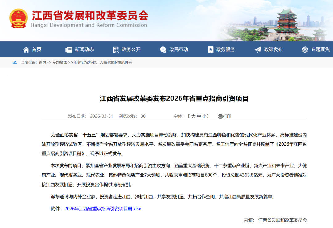 3月31日,江西省发展改革委发布《2026年江西省重点招商引资项目册》,推出600个重点招商项目,投资总额达4363.8亿元,为投资者精准对接江西发展机遇、开展投资合作提供清晰指引。