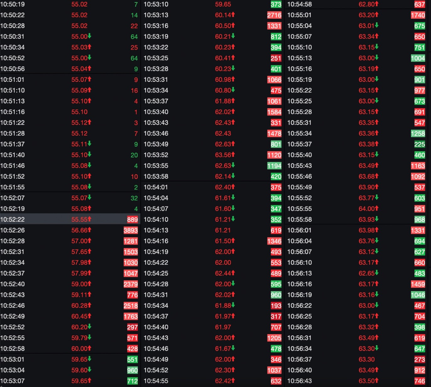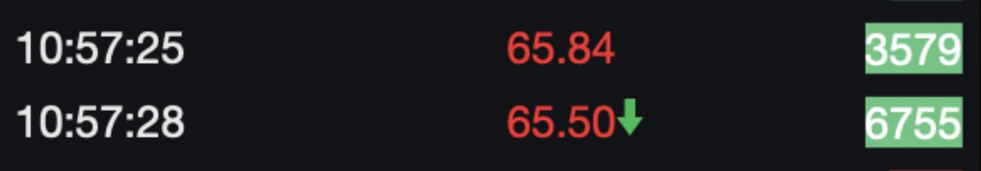 大额卖单集中释放是在10:57:25和10:57:28的两个时间点,两笔卖单分别为3579手、6755手。在10:59:32之前,百手或者千手左右的买单和卖单持续成交,多空双方持续博弈,成交活跃度维持高位。