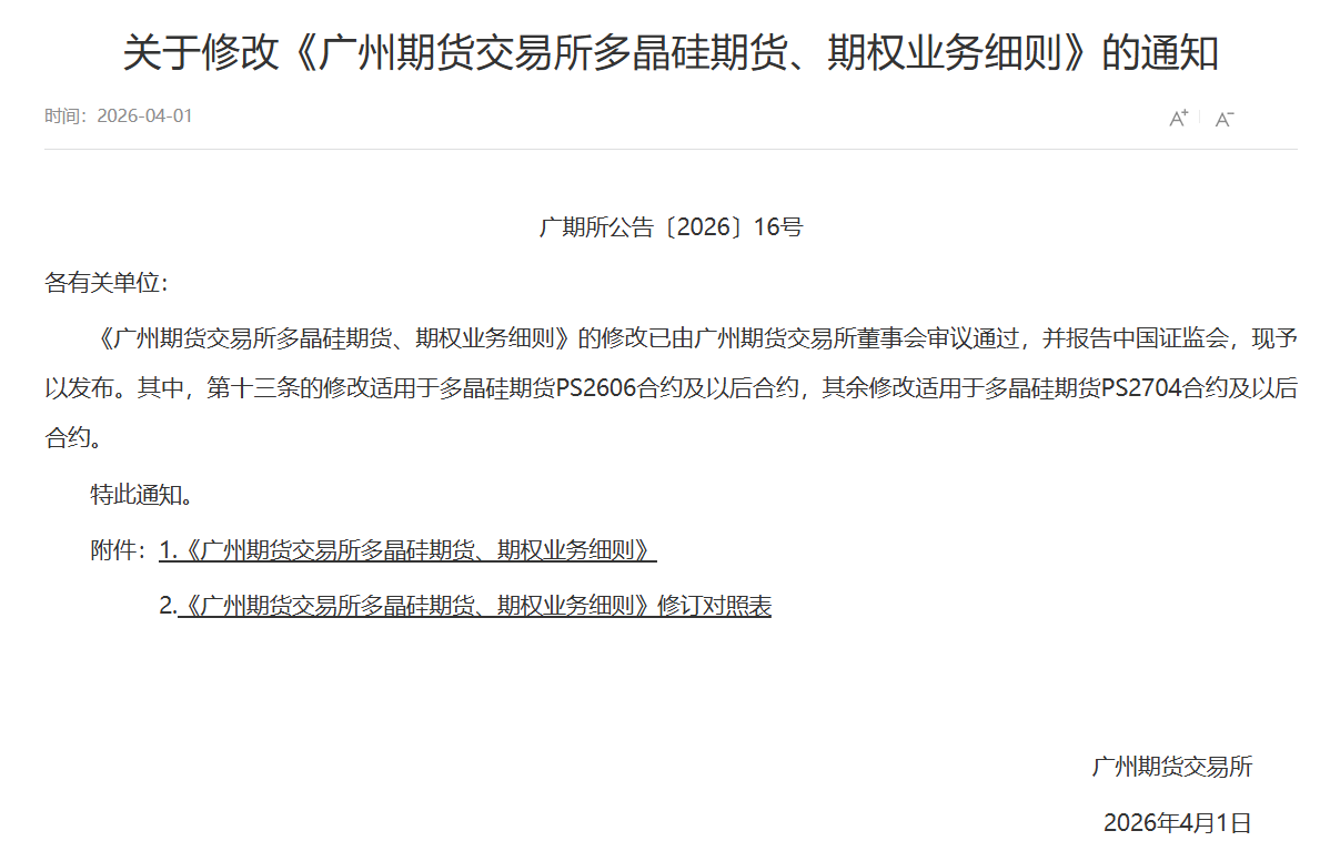 【大河财立方记者王宁宁】4月1日,广州期货交易所(简称广期所)发布多则公告,对多晶硅期货合约的交割质量标准、持仓限额以及风控措施进行调整。
