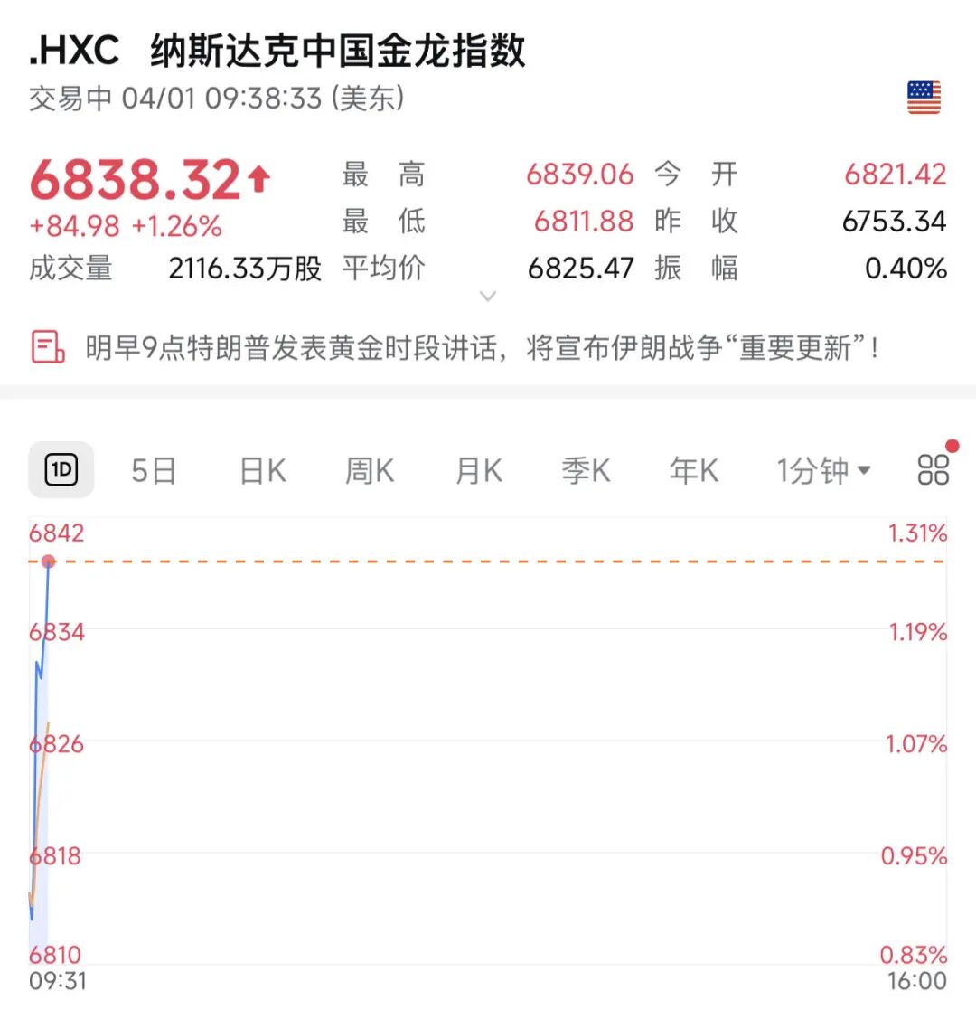 当地时间4月1日,美股三大股指全线高开,截至发稿,道指上涨0.75%,标普500指数上涨0.85%,纳指上涨1.19%。